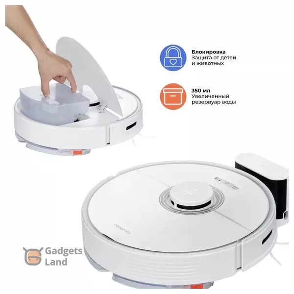 Особенности конструкции: акселерометр, датчик перепада высоты, индикатор заполнения пылесборника, лидар, мусоросборник в базе, мягкий бампер, станция самоочистки, датчик застрявшего колеса, датчик защиты от падения, датчик скорости вентилятора